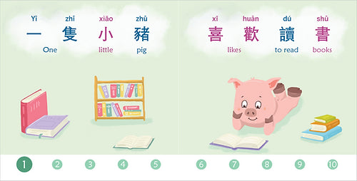 One Little Pig introduces little ones to numbers, animals, and simple phrases through playful rhymes in Mandarin. Count the animals from one to ten—see what they like to do and where they want to go!